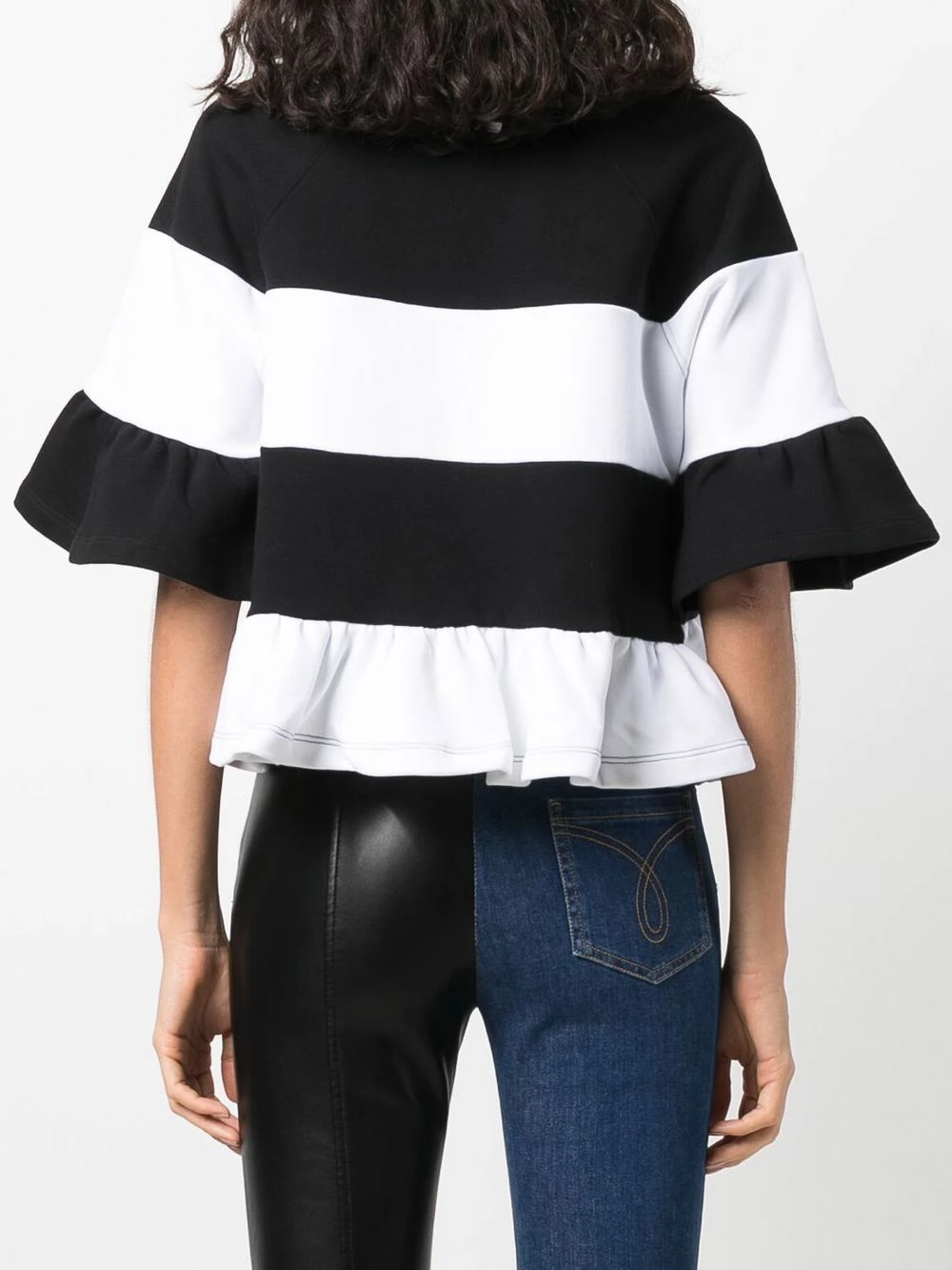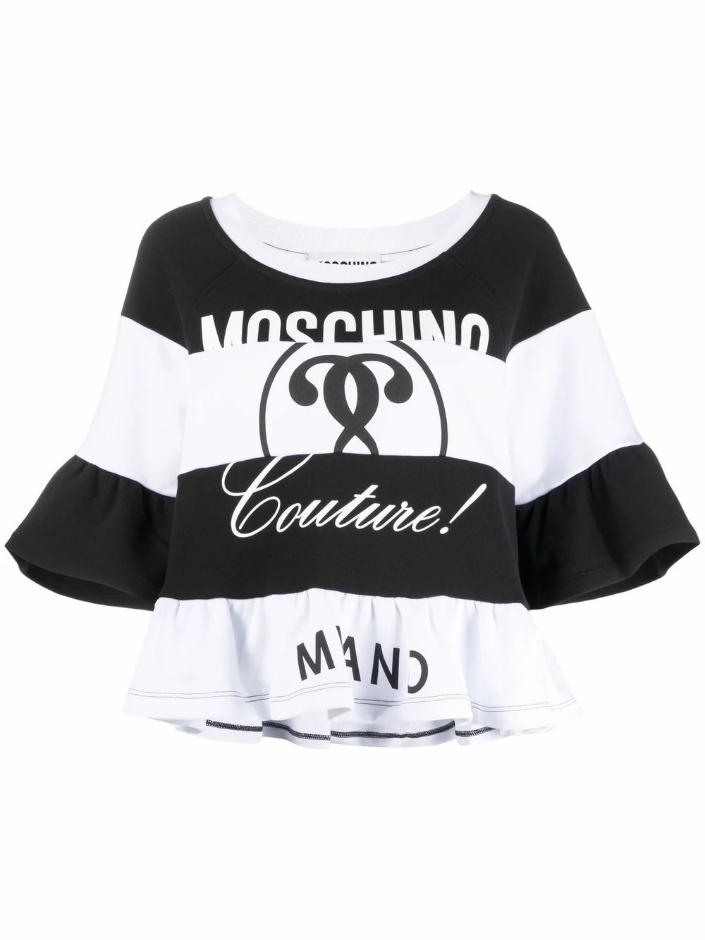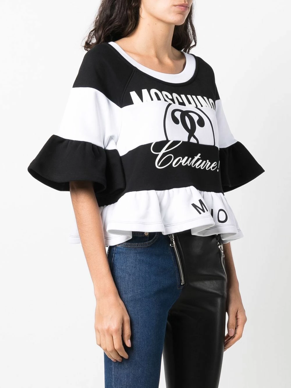 Never one to shy away from bold logos, Moschino presents this T-shirt. Crafted from cotton, the peplum silhouette is decorated with a patchwork print of two of the brand’s iconic motifs.
