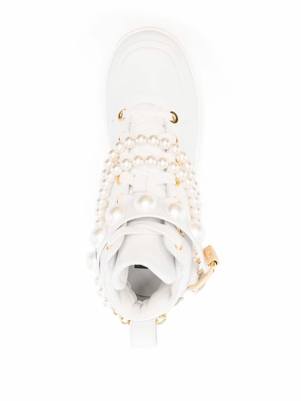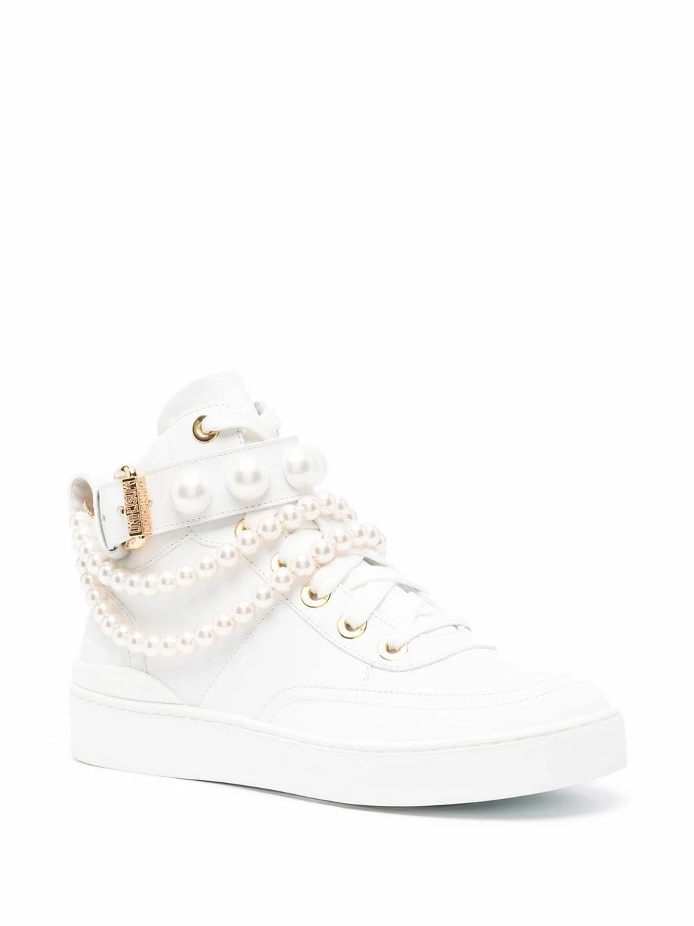 Focused on adding a playful flair to sporty silhouettes, Moschino presents these mid-top sneakers. Sitting on a flat sole, this ankle-length pair is adorned with faux-pearl embellishment at the upper and a gold-tone buckle fastening for a fun twist.