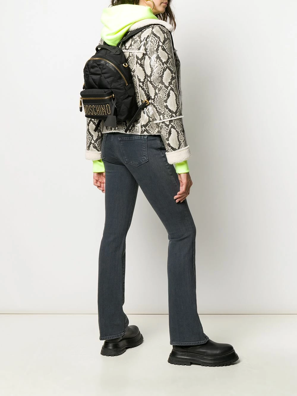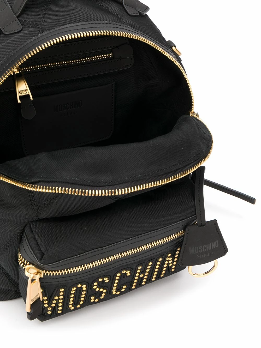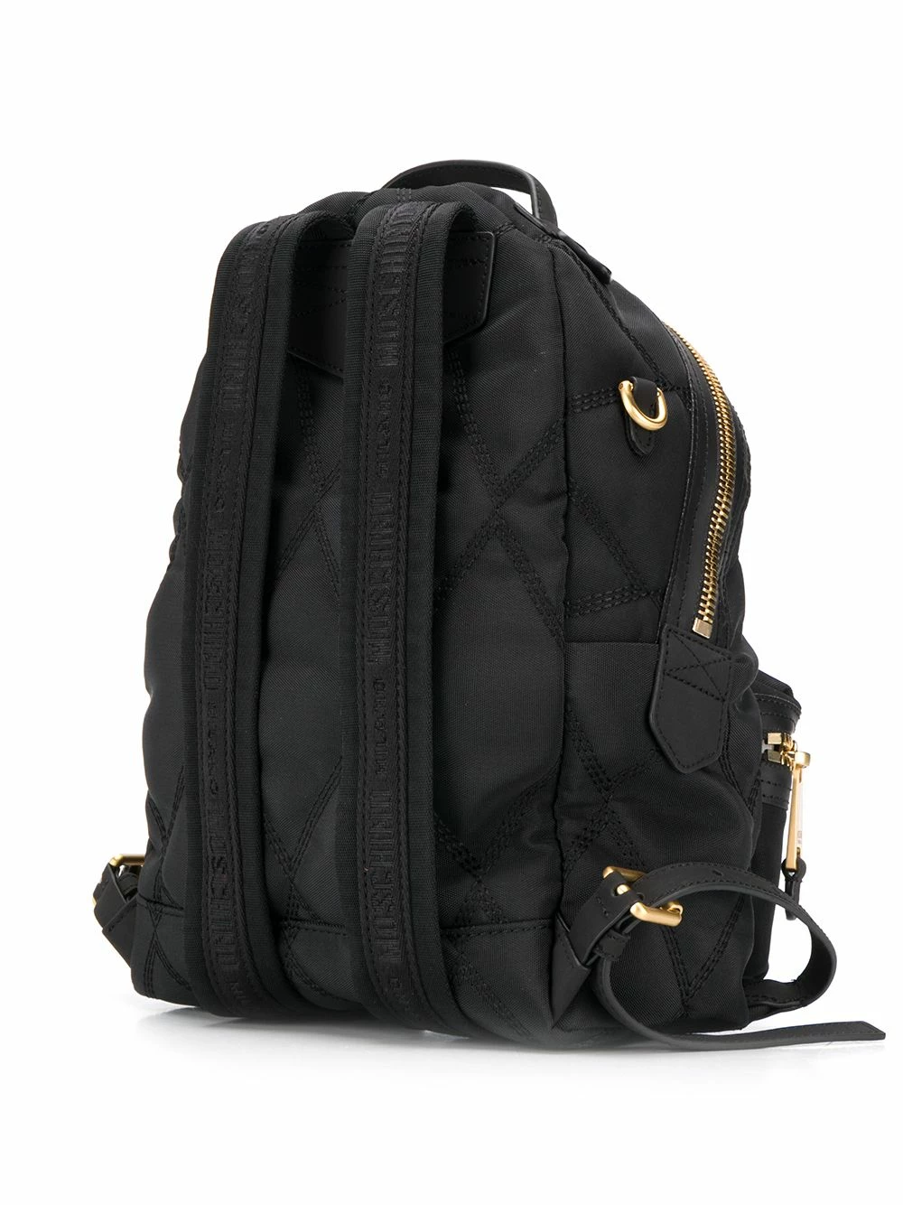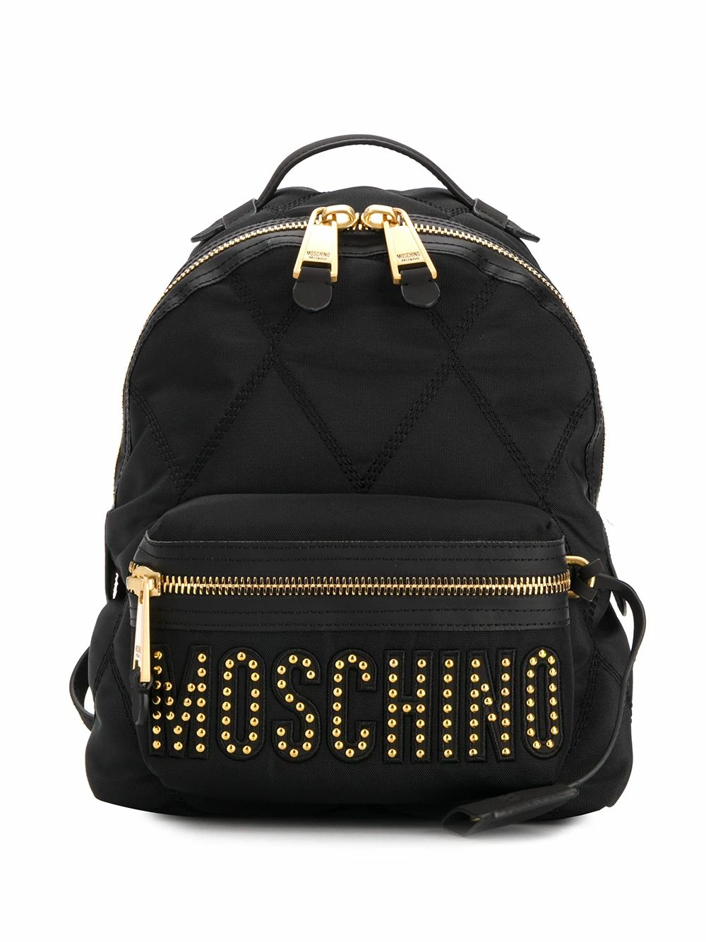Is it even Moschino if it doesn’t have the logo somewhere? Well with this black quilted logo backpack from Moschino, you will never mistake it for anything else thanks to the front studded logo patch. Say it loud. Featuring a top handle, adjustable shoulder straps, a diamond quilted finish, a top zip closure, a front zip compartment, a printed logo, a gold-tone stud detailing and internal pockets.