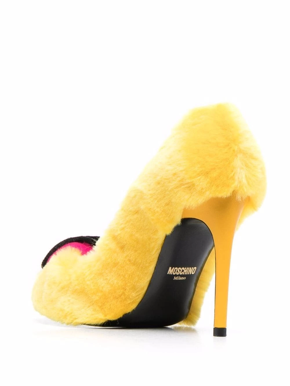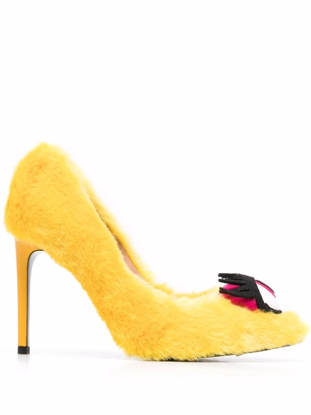 Celebrating the label’s playful aesthetic, these faux fur pumps from Moschino are detailed with a three-dimensional eye motif at the toe. Set atop a high stiletto heel, these leather design is presented in a sunshine yellow hue.