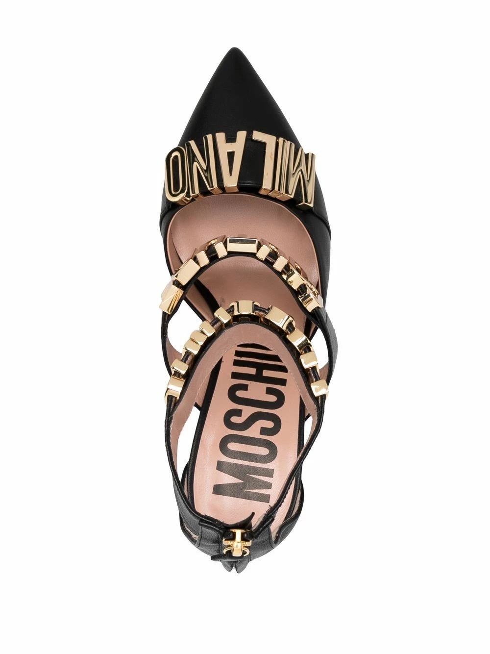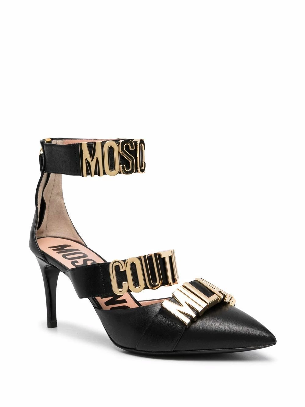 Taking a step away from its usual penchant for bold motifs and colourful patterns, Moschino’s AW21 collection takes a more subdued route. These stiletto-heel pumps perfectly exemplify that through their black leather construction and gold-tone plaque.