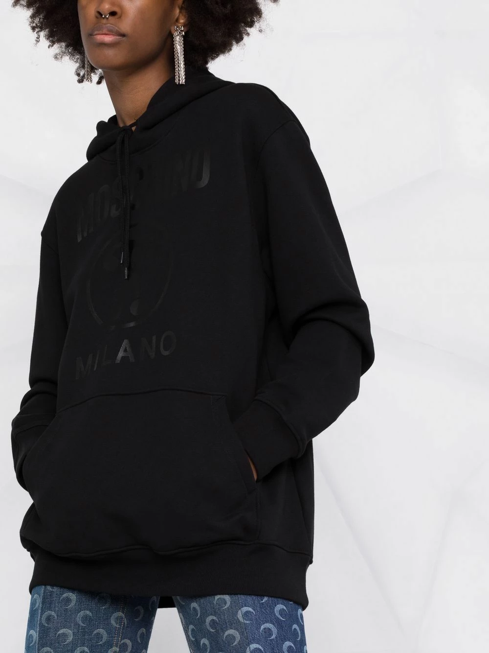 Moschino places the brand’s logo print across the front of this drawstring hoodie, which ties in with current trends of branding in streetwear style. In a tonal colourway, it adds a refined edge.