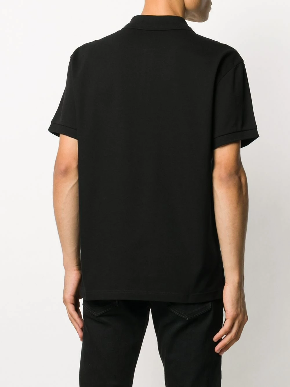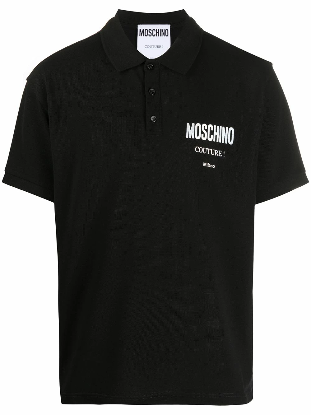 A staple with a twist. The metallic silver logo print on this short-sleeve polo shirt from Moschino is sure to shine a spotlight on your daytime style. Be prepared to get noticed.ย