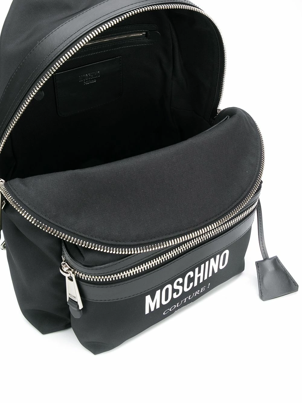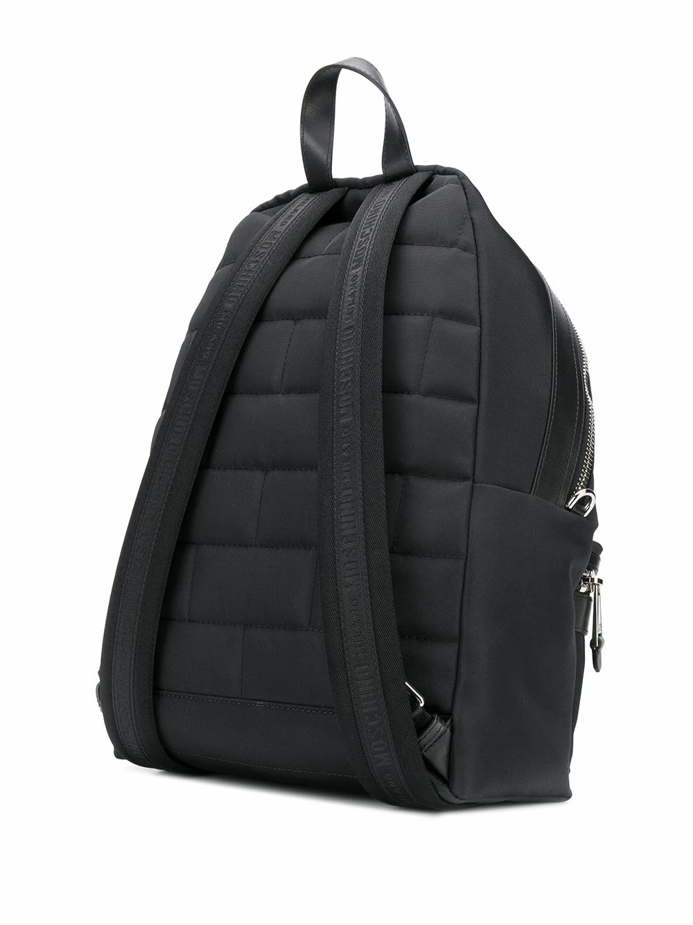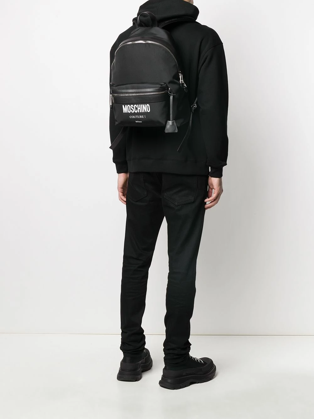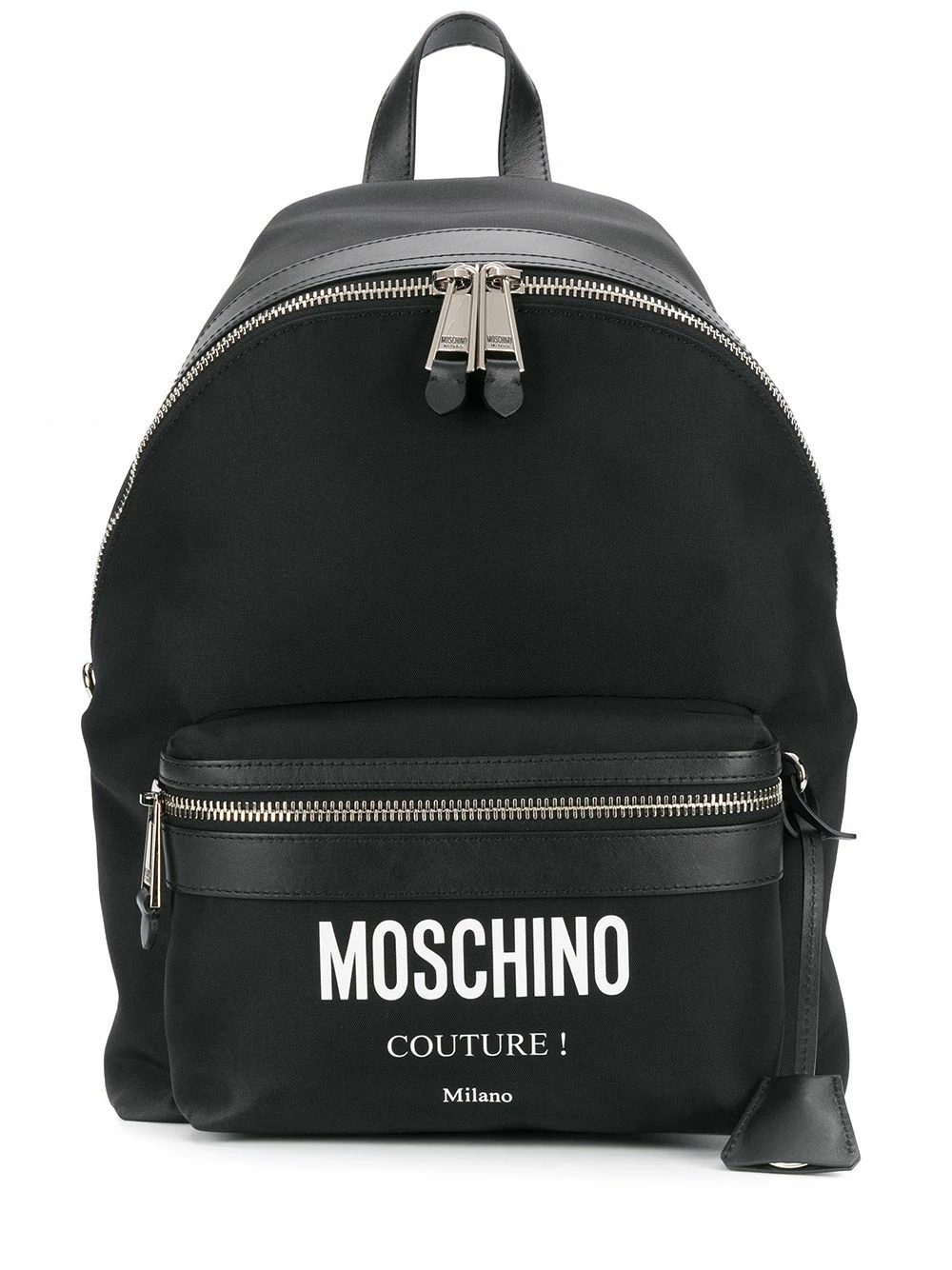 No more excuses to keep stuffing your jeans’ pockets. Decorated with a white printed logo to the front, this black backpack from Moschino has enough space to let you carry your essentials around in the most comfortable (and stylish) way. Featuring a round top handle, adjustable shoulder straps with a tonal logo tape, a two-way zip fastening, a main internal compartment, an internal zipped pocket, an internal logo stamp, a front zip compartment, a hanging leather tag, leather trimming and silver-tone hardware.