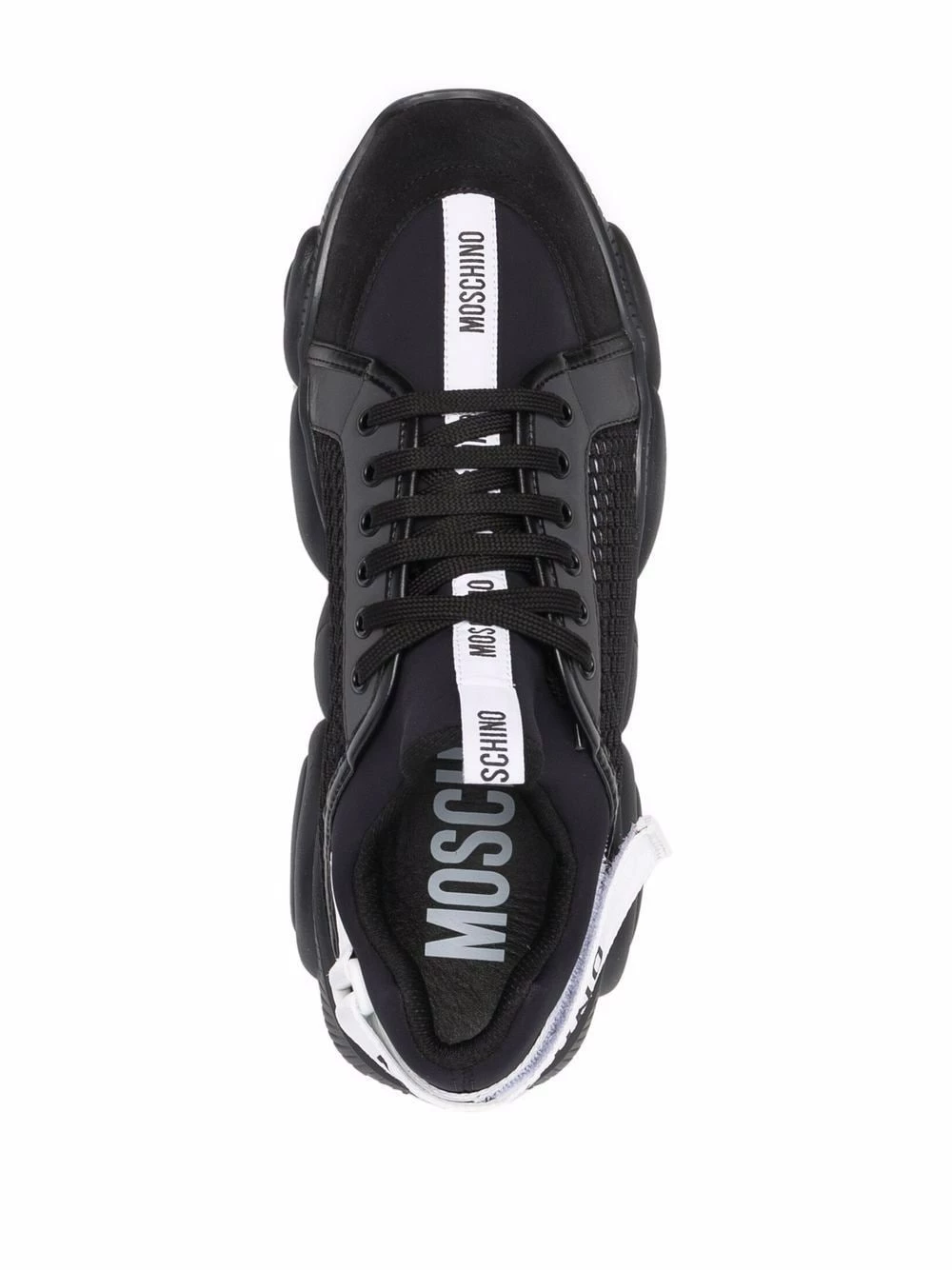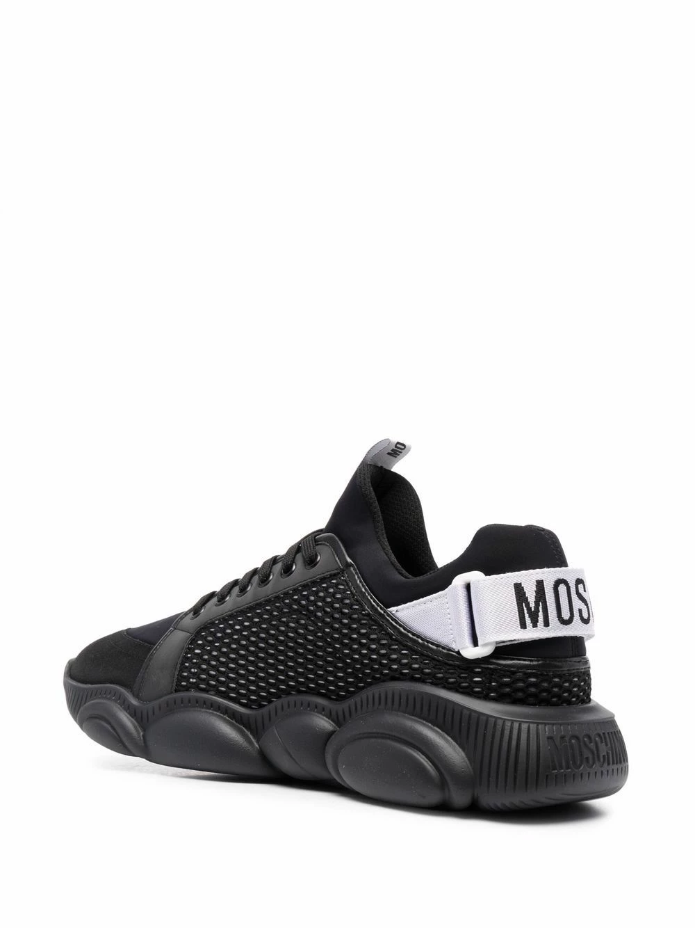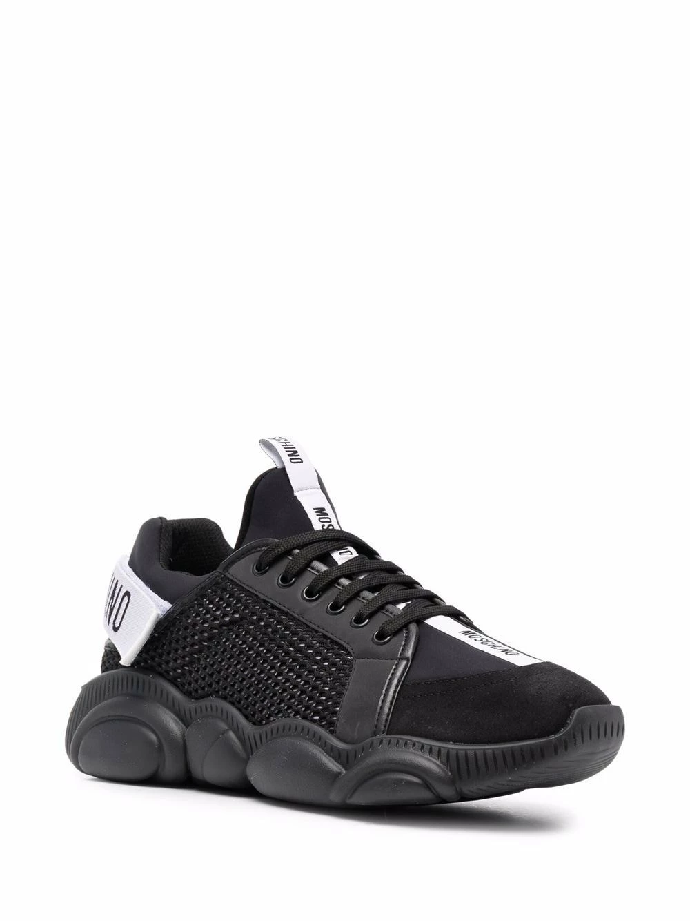 The teddy bear has become a key motif for Moschino over the years. Today it is presented carved out on the rubber soles of these sneakers – adding subtle branding to this black and white design.