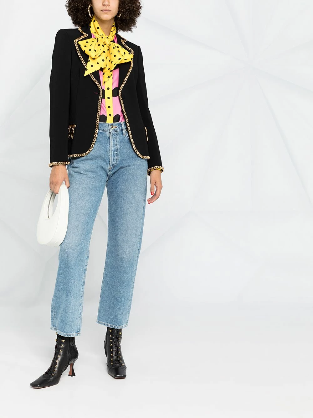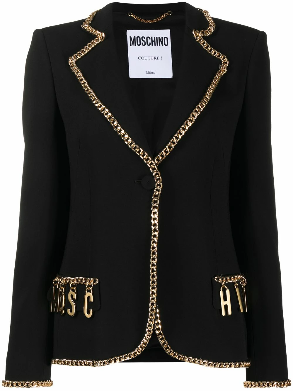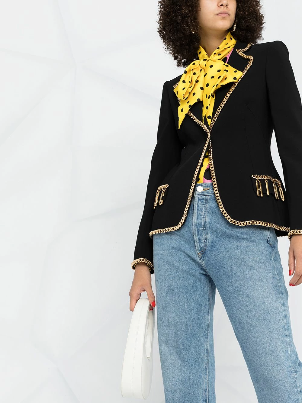What is keeping you from being the best version of yourself? Could it be that your wardrobe is not rising to the challenge? With this chain-trimmed blazer from Moschino, that is about to change. A gold-tone chain trim adds a sophisticated finish to this cropped design, while the gold-tone logo lettering ensures everyone knows where your loyalty lies. Reaching your full potential has never been easier.
