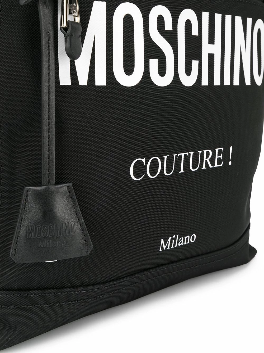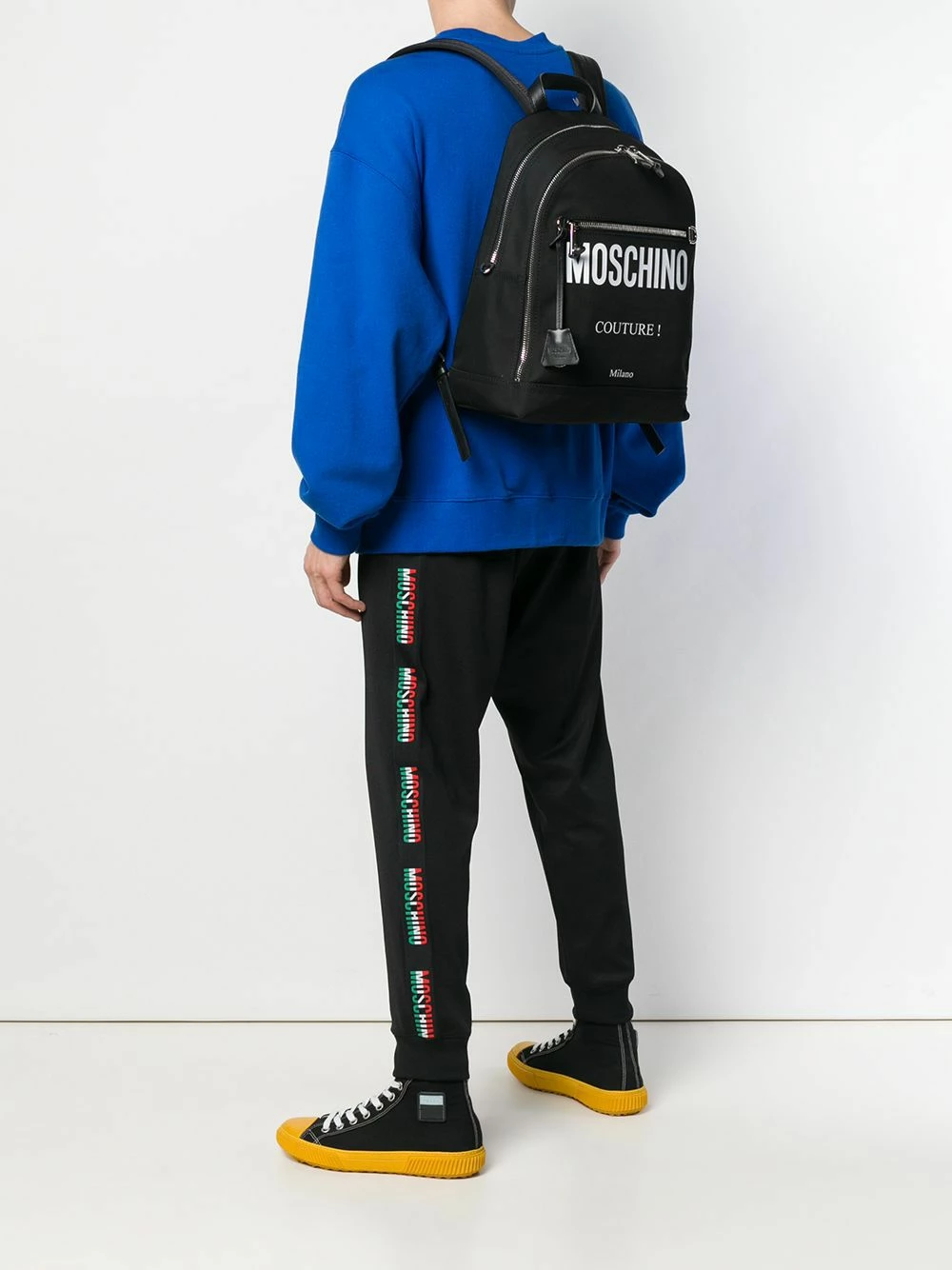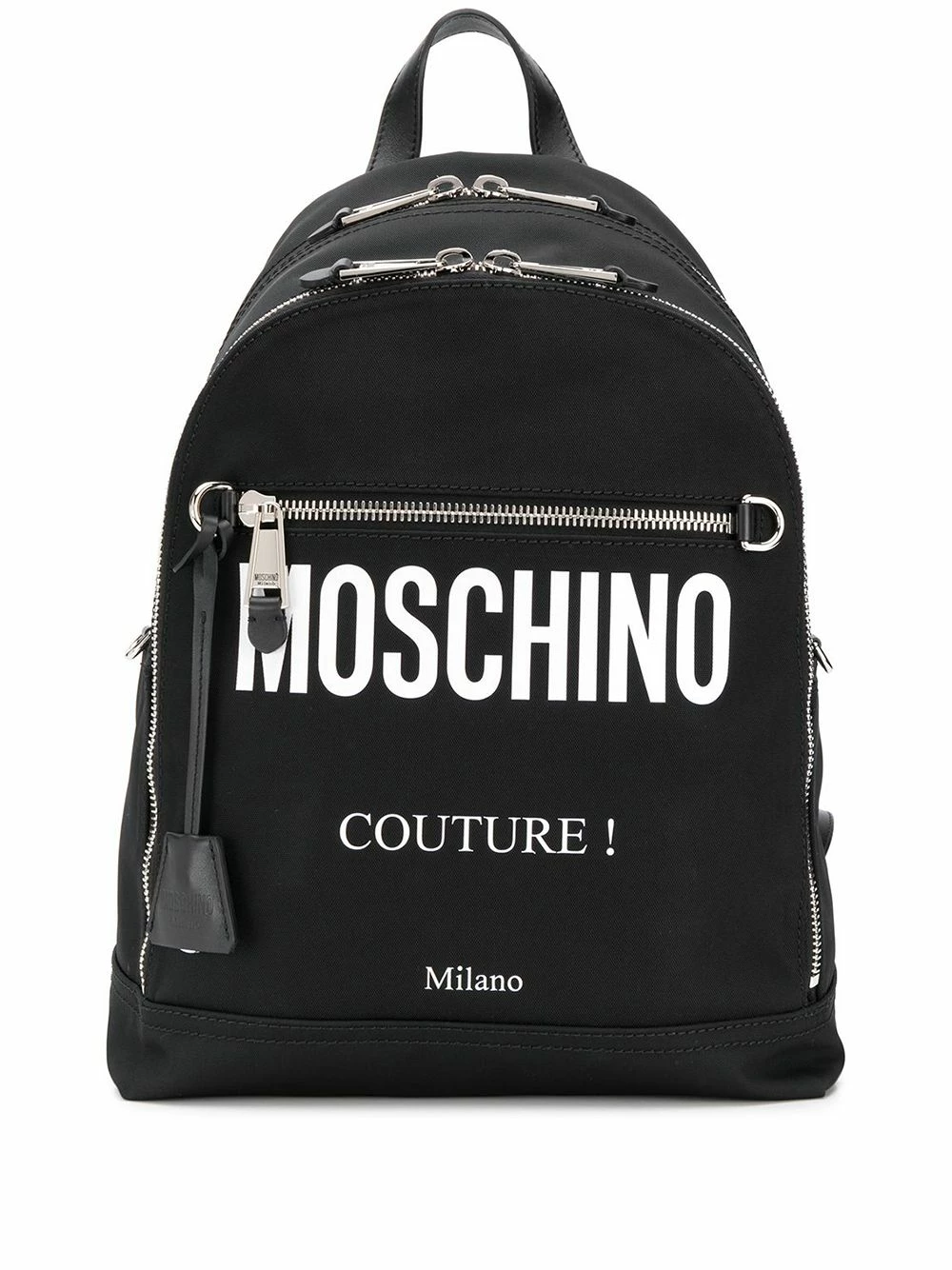 The Moschino collection is characterised by a rebellious attitude, a youthful aesthetic and iconic logos as showcased in this ‘Moschino Couture!’ backpack. Crafted from black leather, this backpack from Moschino features a top handle, adjustable shoulder straps, a double top zip closure, an internal zipped pocket, an internal logo stamp, a front zip pocket, a hanging key fob and silver-tone hardware.