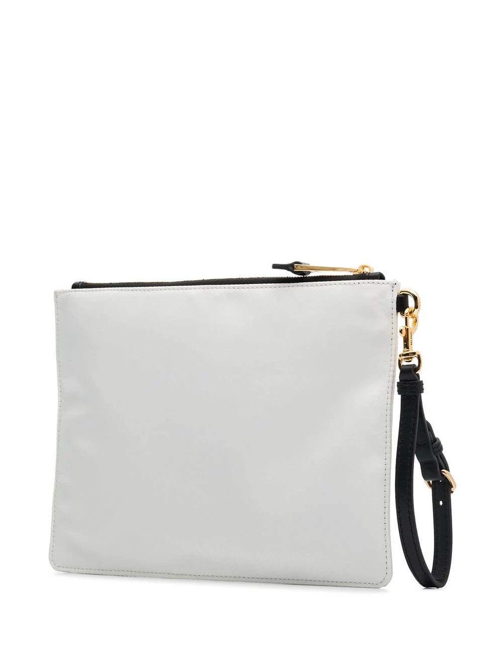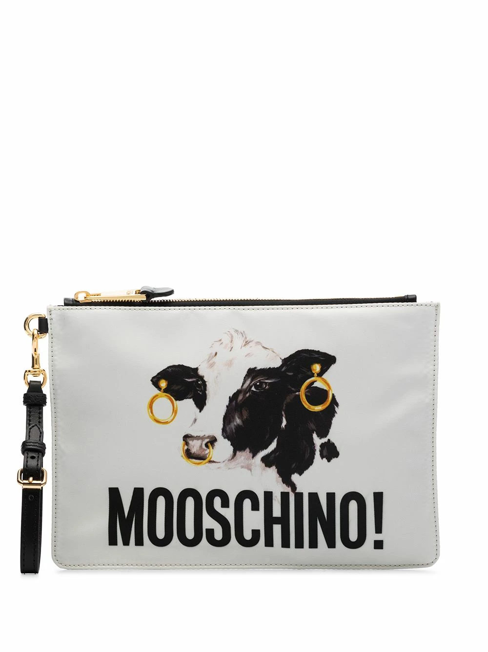 Channelling Moschino’s lighthearted approach to streetwear, this clutch from the brand’s AW21 collection is embellished with an illustration print of a cow completed with a logo motif on top. Finished with refined gold-tone hardware and a practical detachable wrist strap, this piece features a top zip fastening and an internal zipped compartment.
