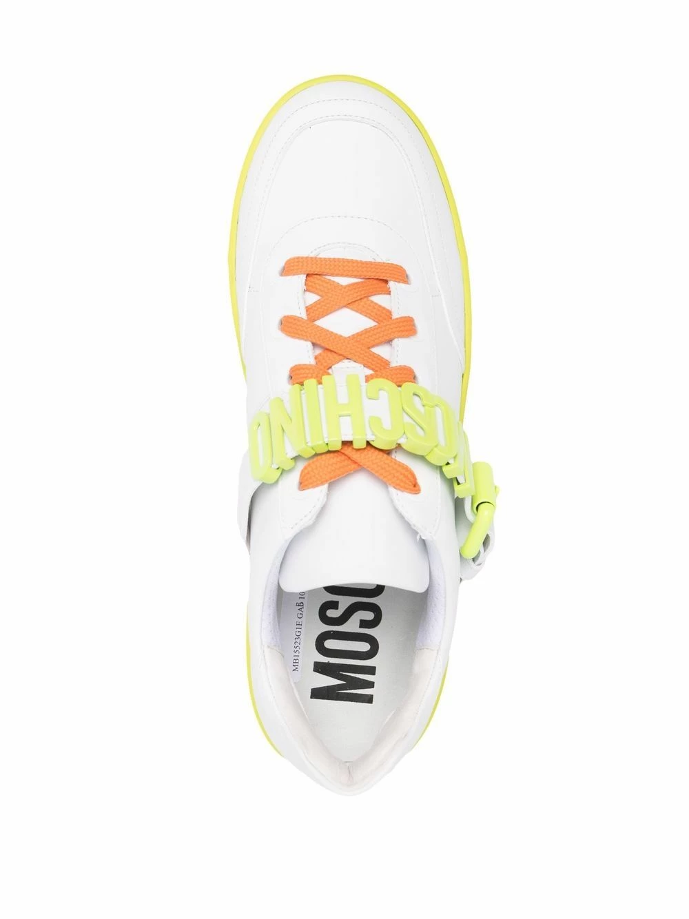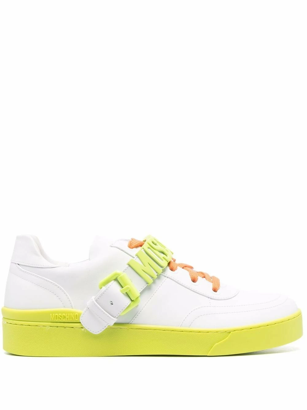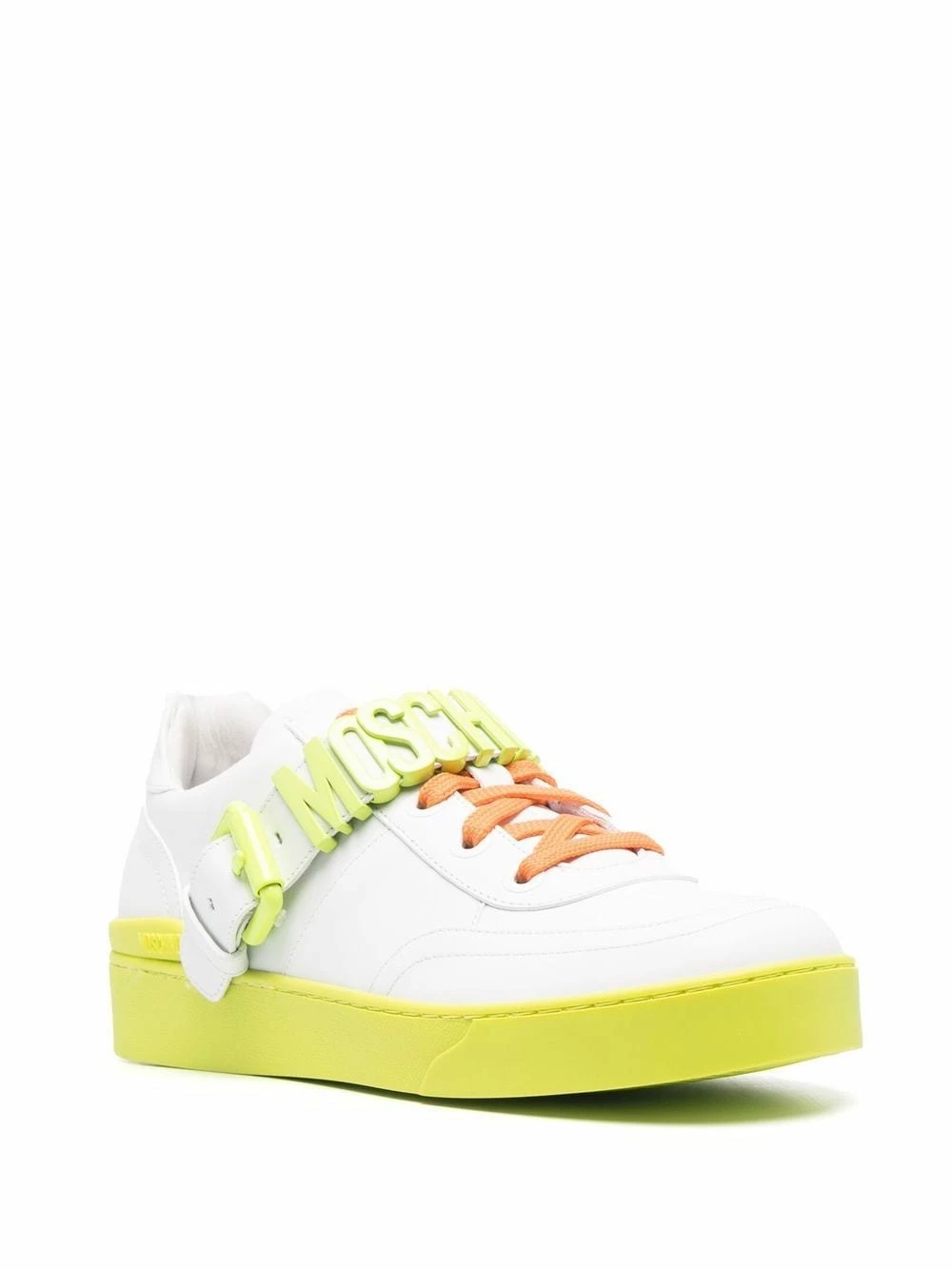 Moschino brands this pair of low-top sneakers in large neon-green lettering across the front. Boasting a white leather upper construction, a neon-green rubber sole uplifts this footwear.