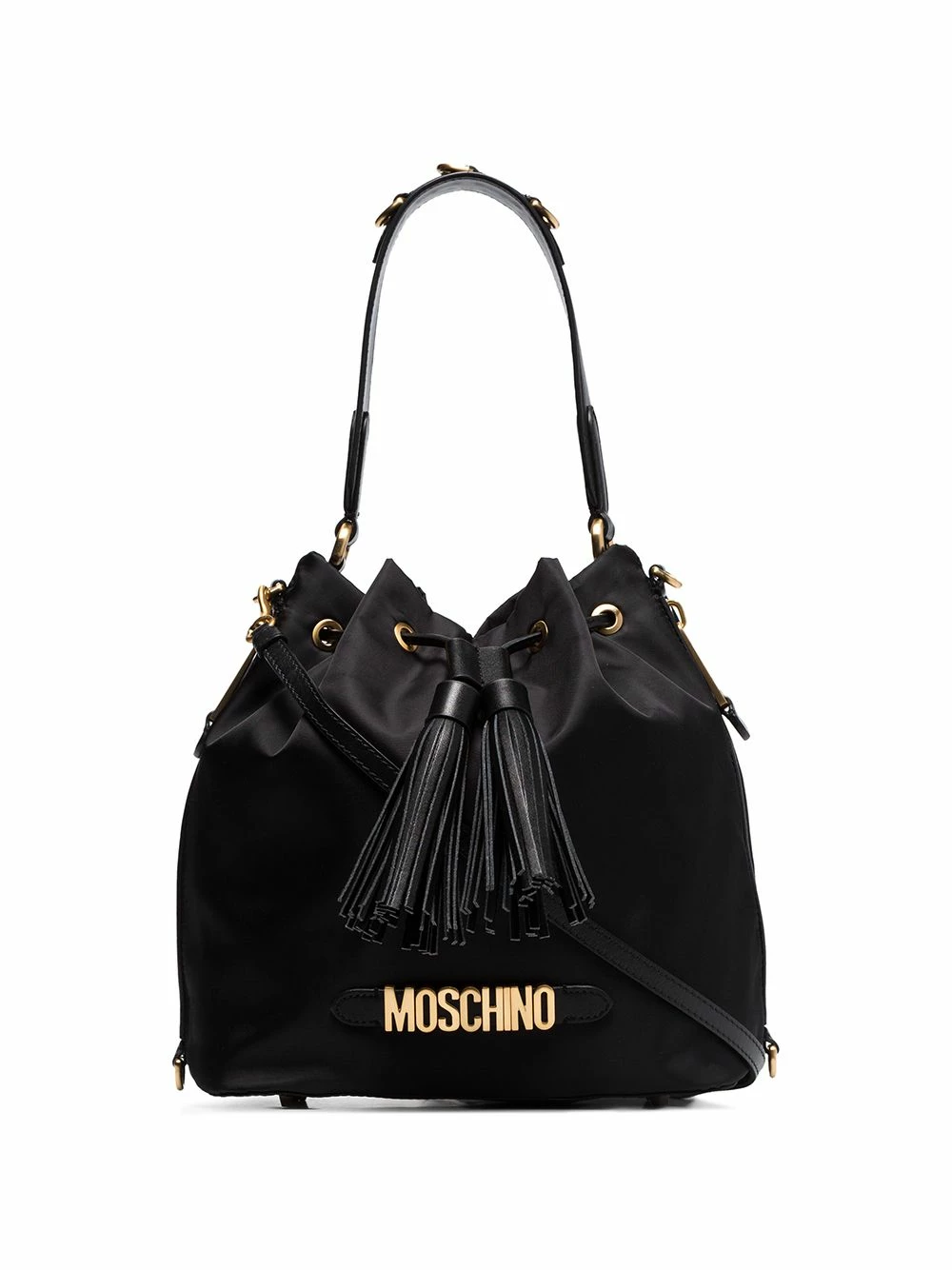 ‘Hey – nice bag, who’s it by?’ – is exactly what you won’t be hearing with this black logo plaque drawstring bucket bag from Moschino. Not because people don’t like it, but because it’s already told them. More than just a pretty bag. Featuring gold-tone hardware, a top handle, a detachable and adjustable shoulder strap, a front logo plaque and a drawstring fastening.