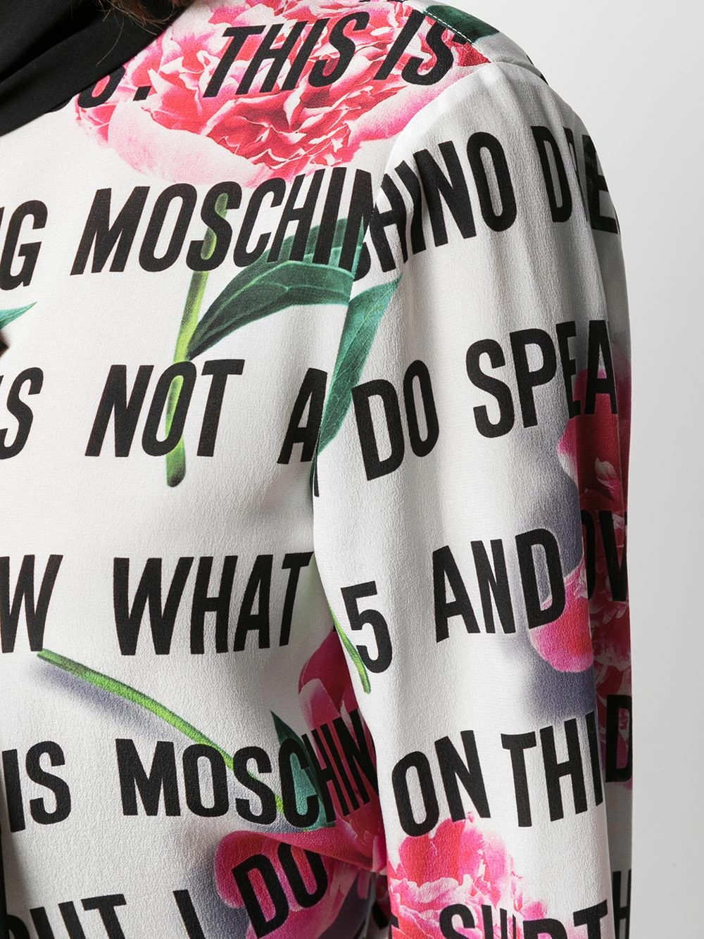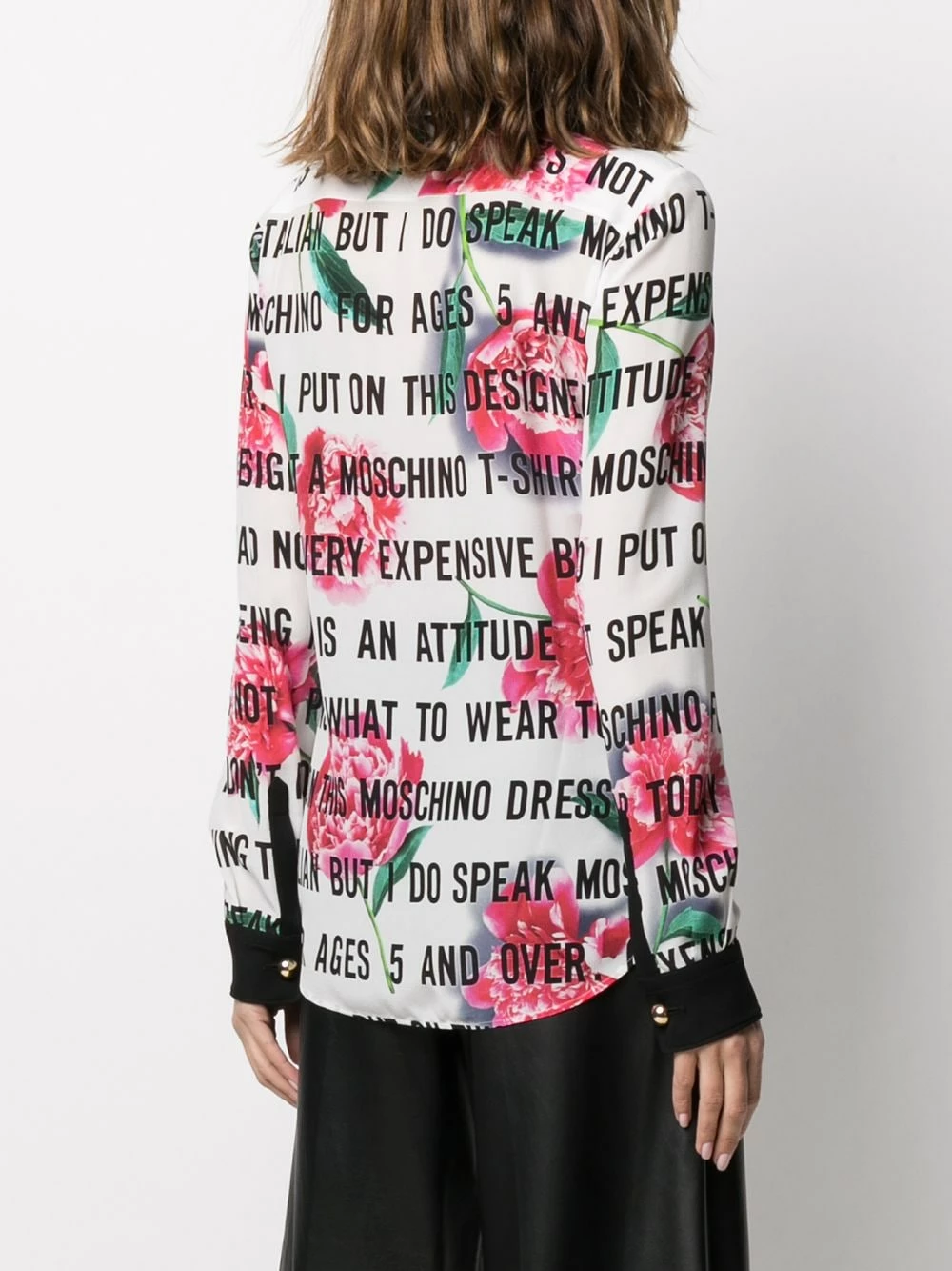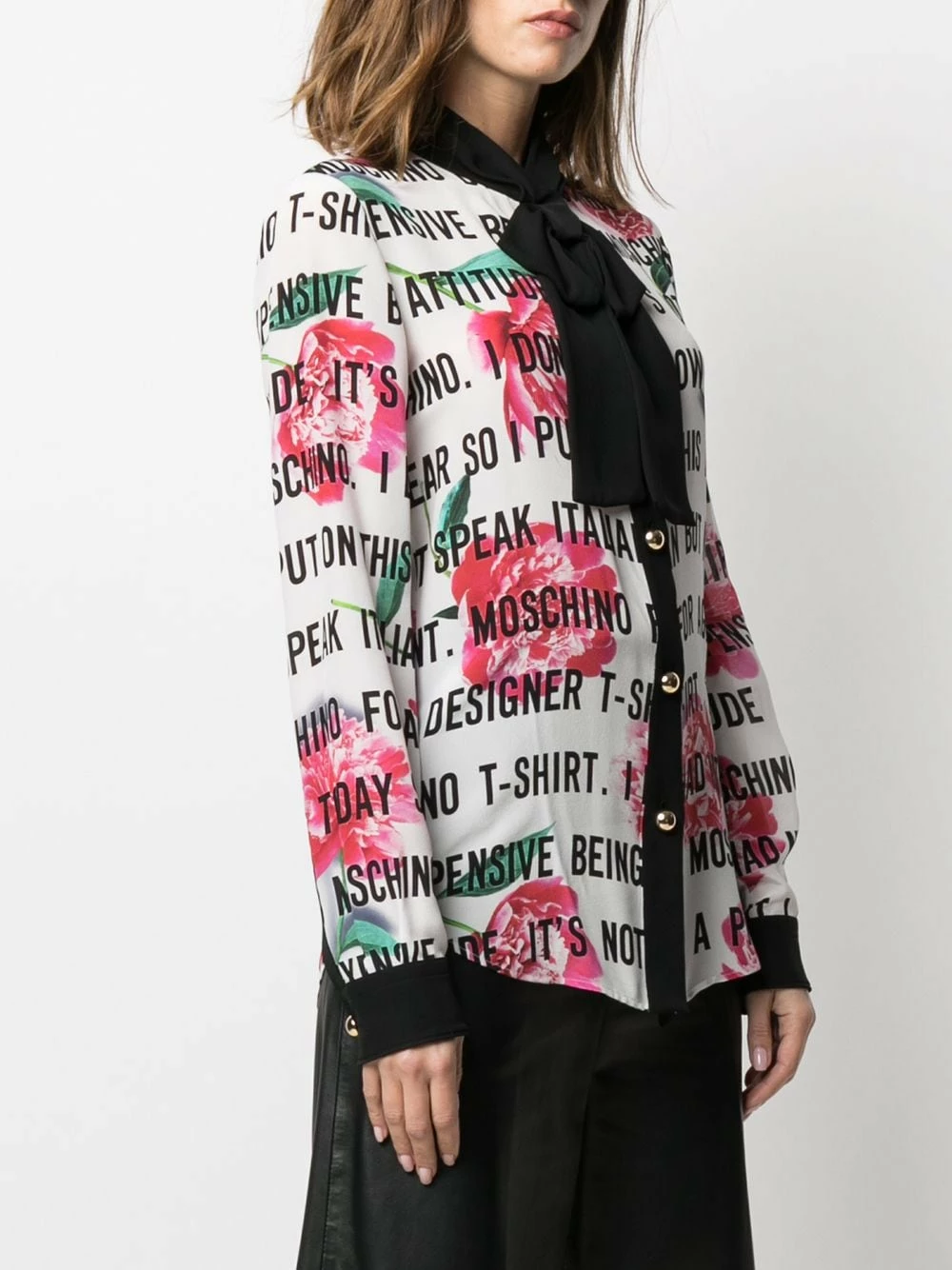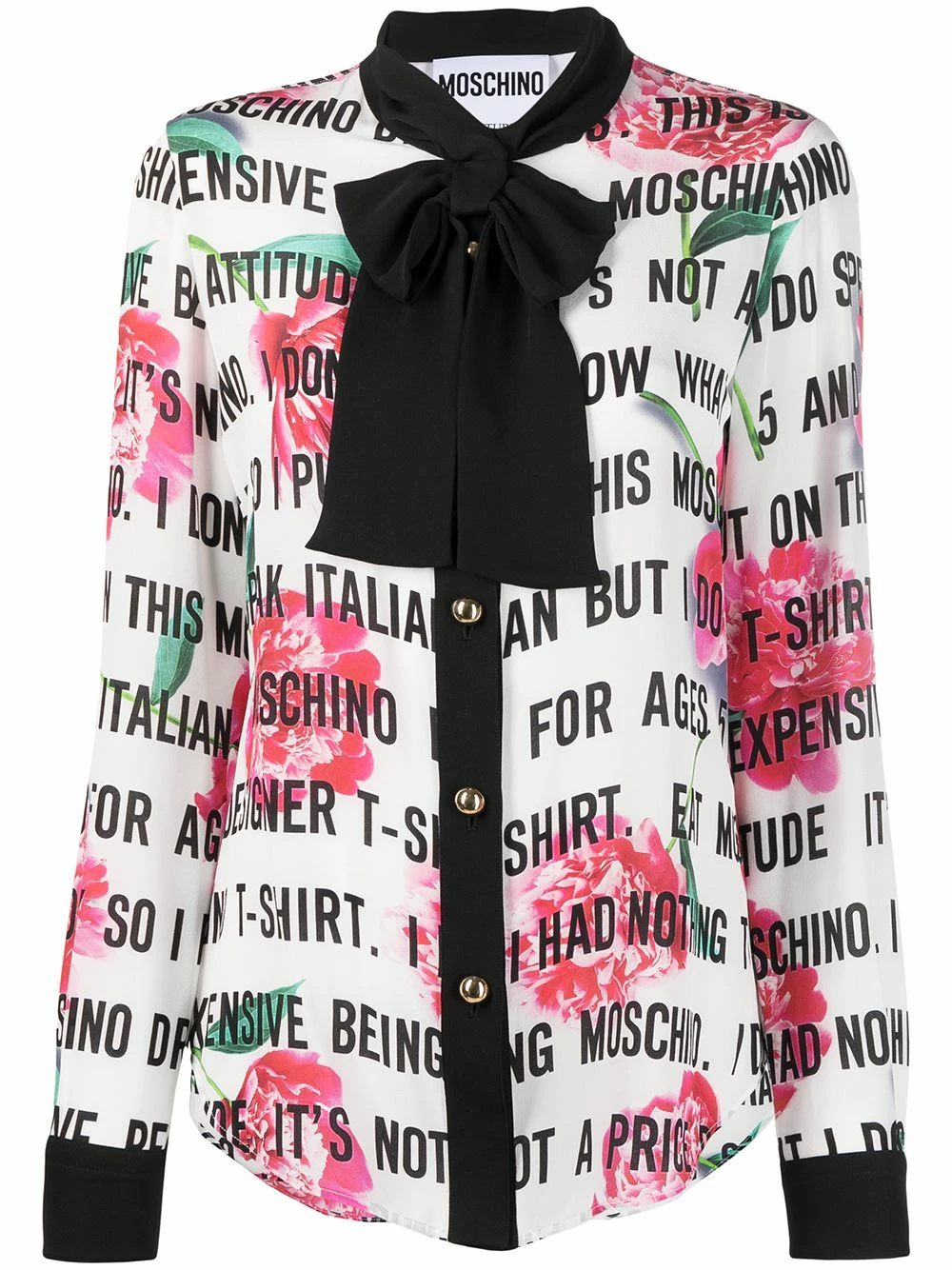 ‘I don’t speak Italian but I do speak Moschino’. Join the Moschino gang and spread the word in this slogan print pussy-bow silk shirt by the Italian fashion house. Cue the compliments.