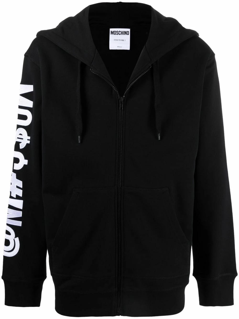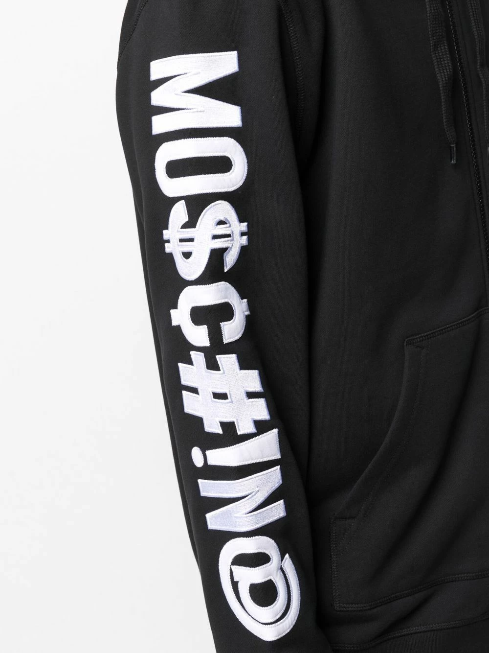 Known for adding fun twists to practical silhouettes, Moschino presents this zipped hoodie. Designed in soft black cotton, this piece is detailed with a playful Symbols logo print to the outer left sleeve.ย