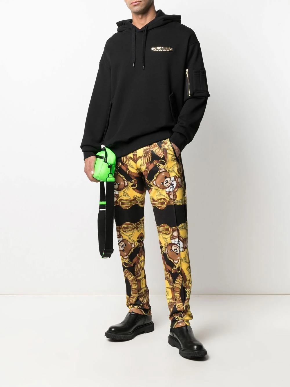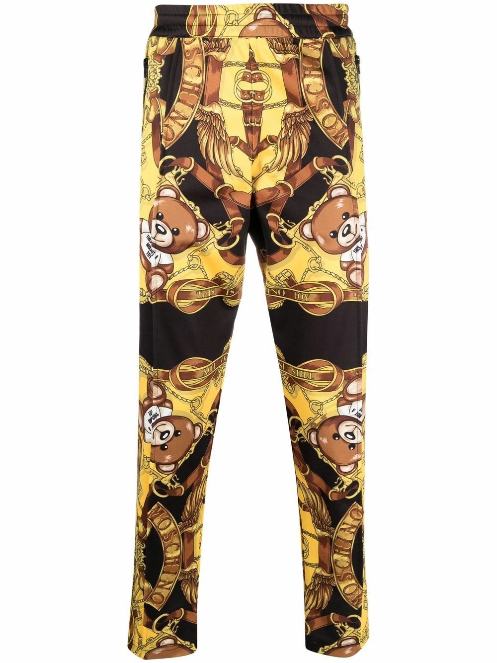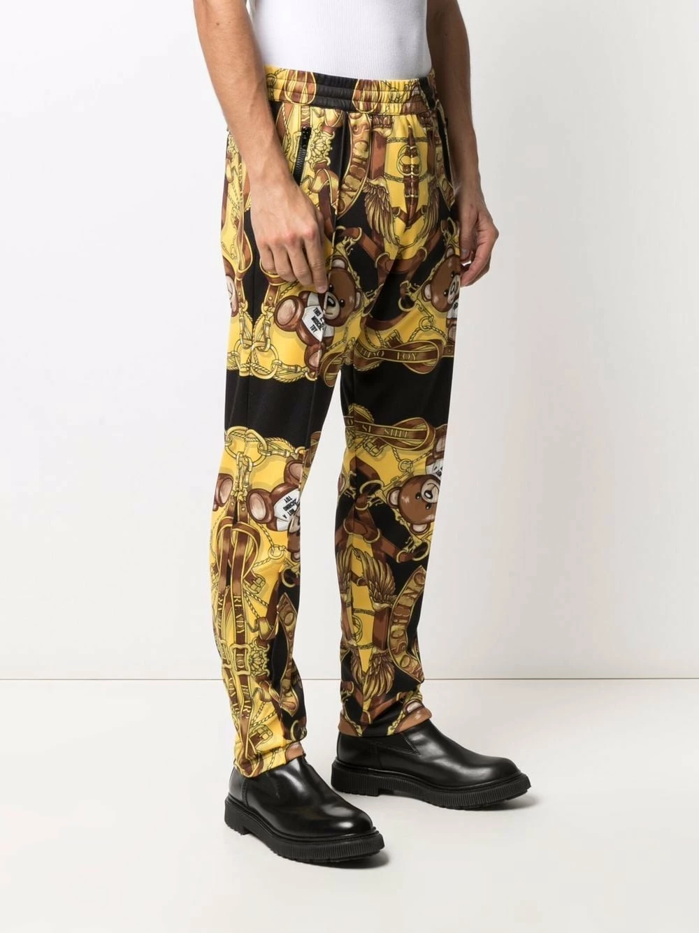 The Toy Teddy motif is symbolic of Moschino’s youthful approach to design. These black and yellow printed track pants feature the emblem throughout.