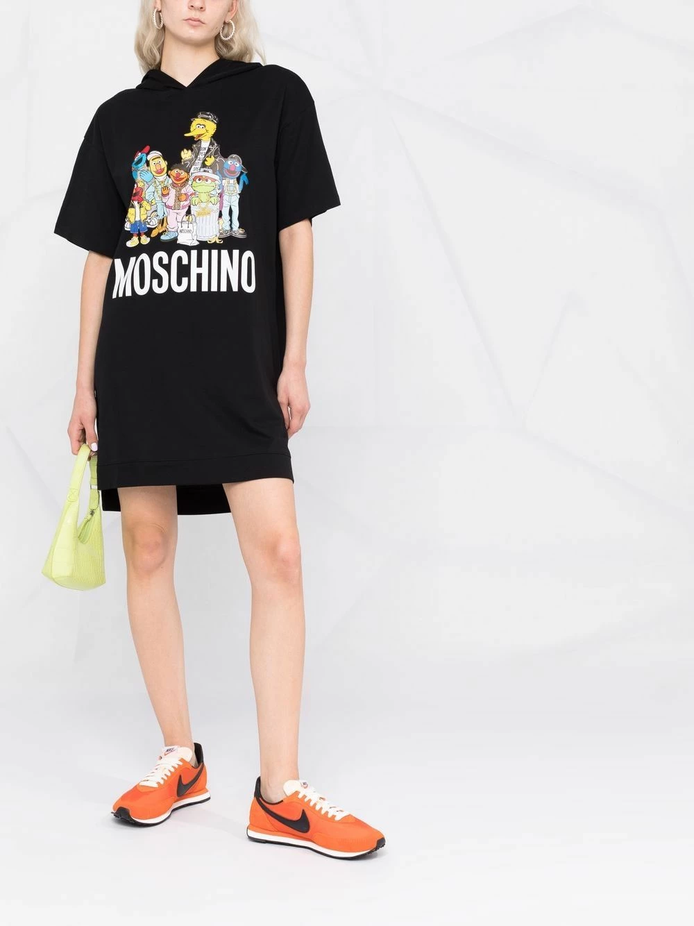 Moschino collaborates with Sesame Street© for its AW21 collection. The likely partnership came from Jeremy Scott’s love of the series’ principles of kindness, confidence, and natural curiosity about the world’s possibilities. This hooded jersey dress is printed with the iconic Sesame Street© characters dressed in Moschino.