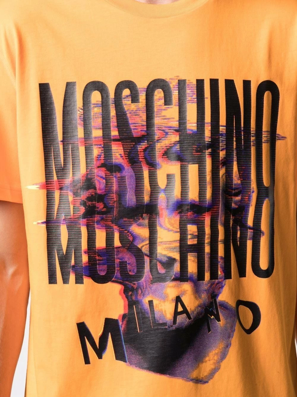 Moschino’s orange T-shirt is elevated with its signature bold design. Notice the distinctive logo and graphic print at the chest.ย