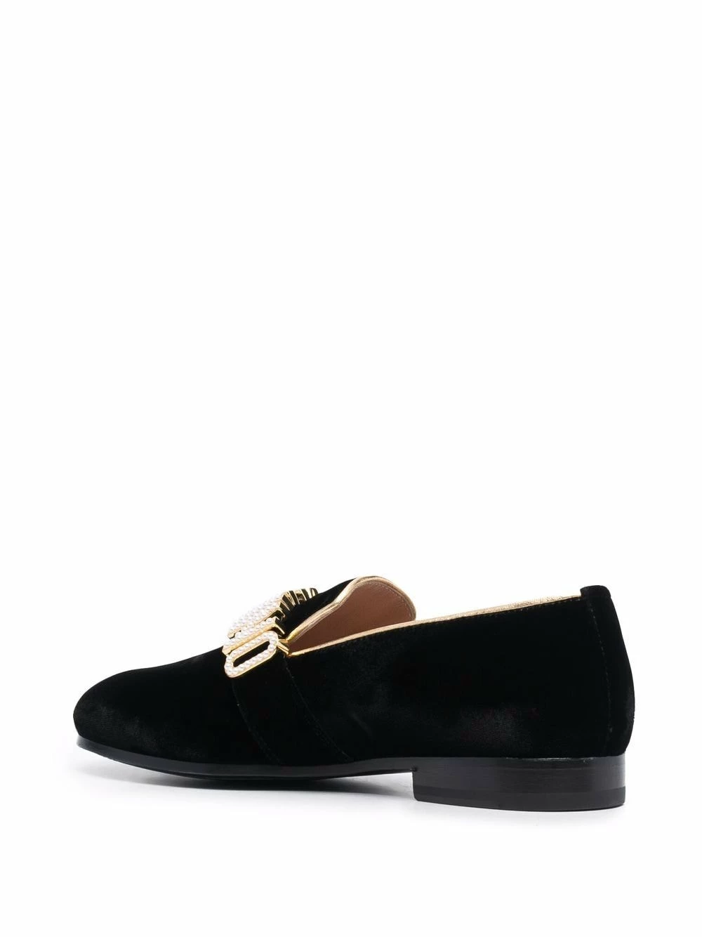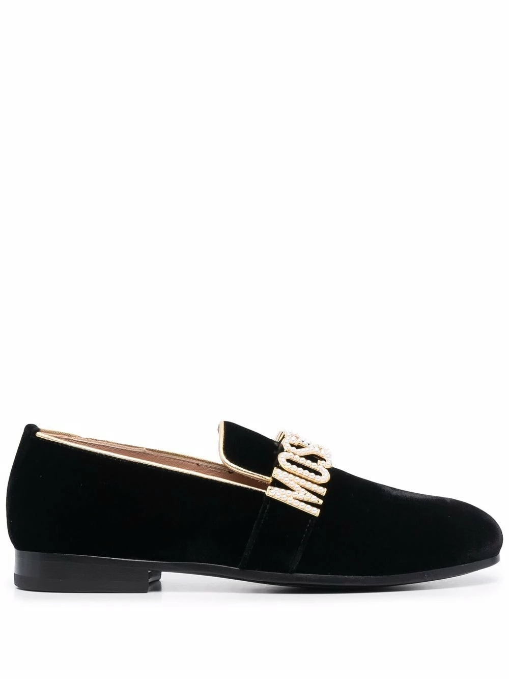 Moschino’s gold-tone logo plaque is one of the label’s most iconic emblems. In these black loafers, the motif takes centre stage against a black-toned velvet construction.ย