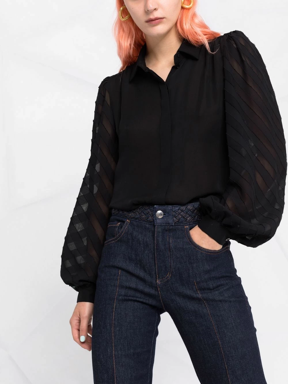 Moschino’s blouse is a departure from the brand’s typically bold aesthetic. This all-black silk iteration is subtly patterned with semi-sheer checked puff sleeves.