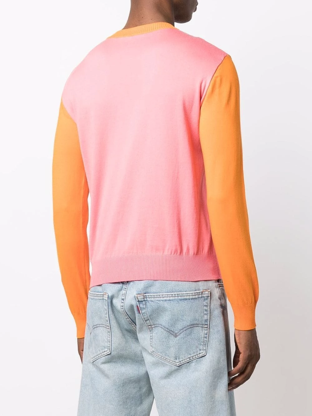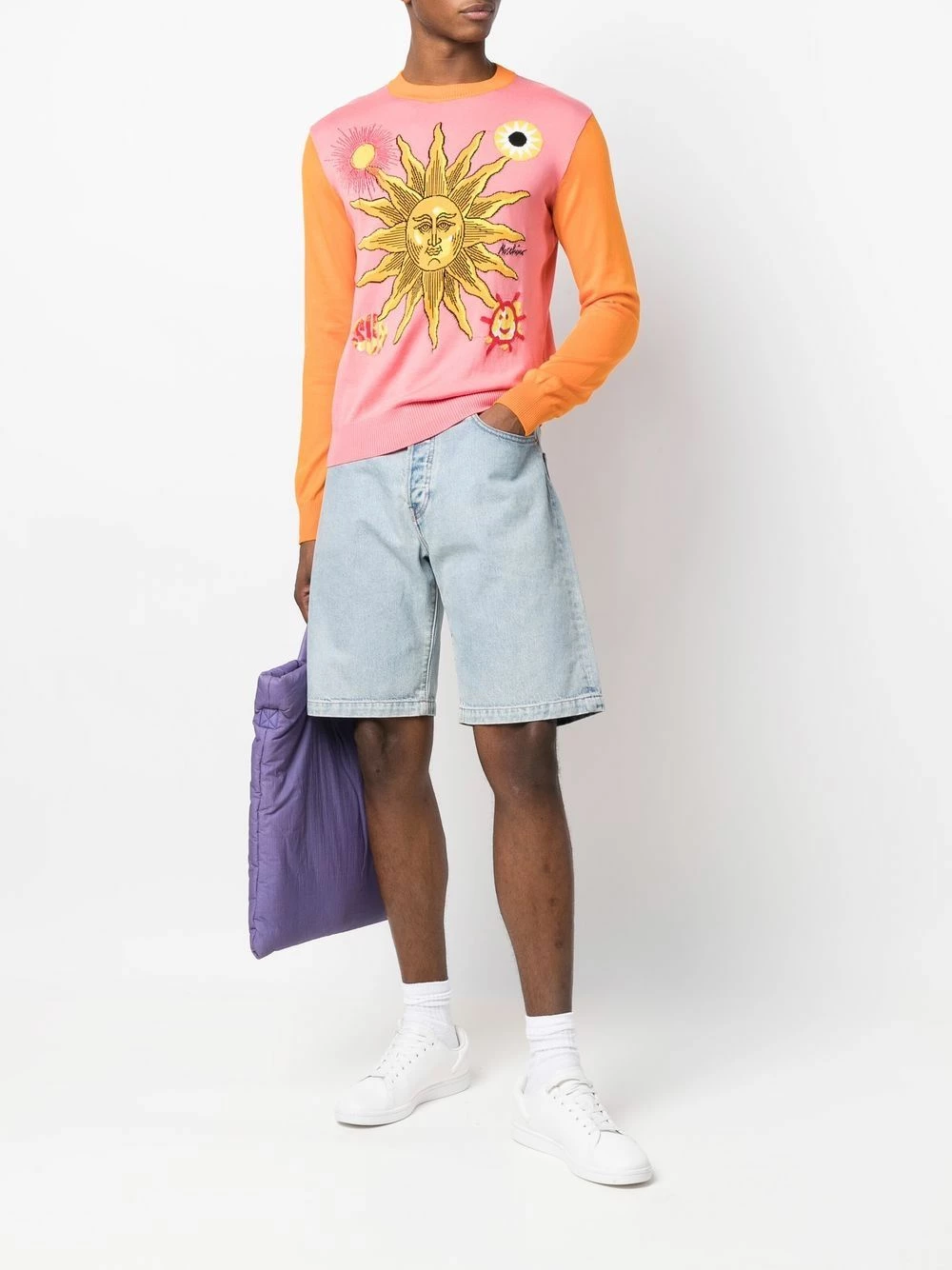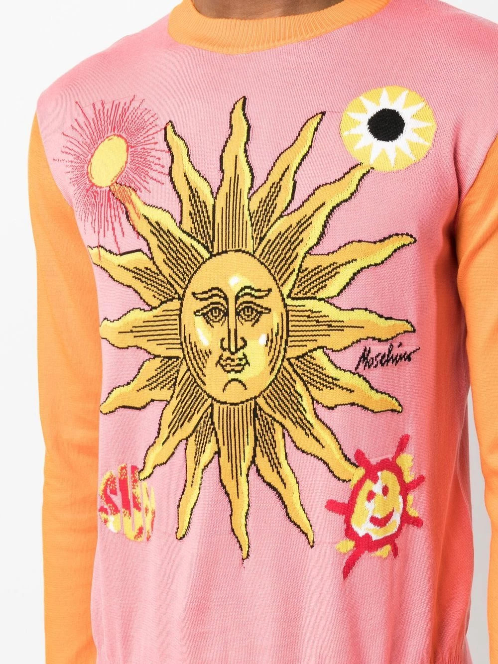 Moschino’s bold style is showcased with this colour-block jumper. Crafted in a cotton construction, multiple sun patterns punctuate the front of the vibrant design, in line with the rest of the collection.